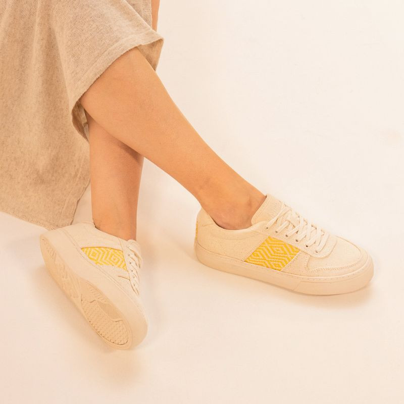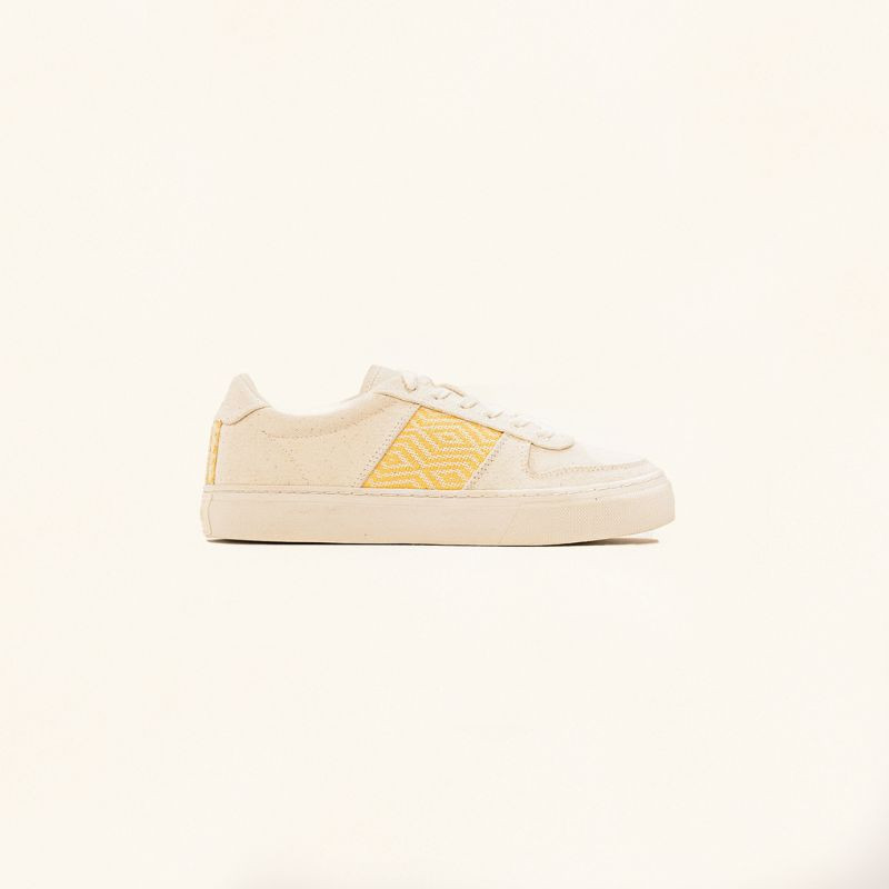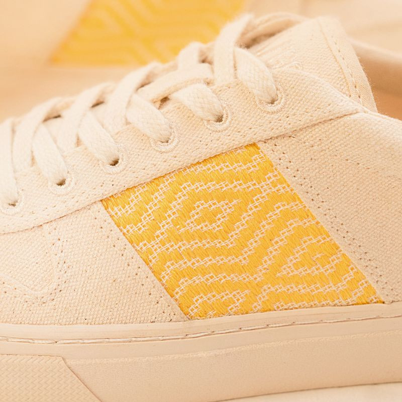 This woven band is the N'GO signature. When you wear these sneakers, you're supporting the skills of independent Vietnamese craftswomen. The motifs in the Mai Chau collection were hand-woven by Thoa, an autonomous and independent Vietnamese craftswoman from the White Thai ethnic minority in Mai Chau, hence the choice of collection name.