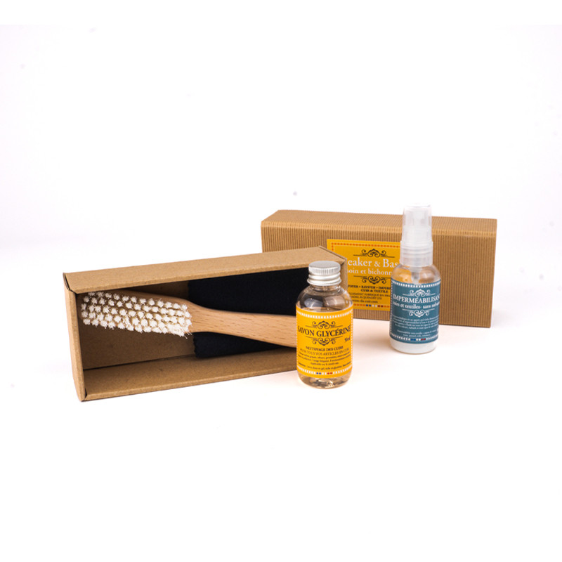 The ideal box to care for your sneakers and sneakers. Includes glycerine soap, nourishing cream, waterproofing agent, cloth and polishing brush.