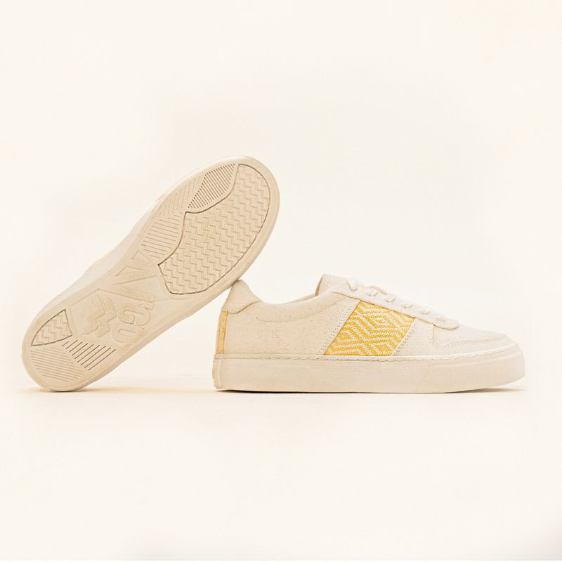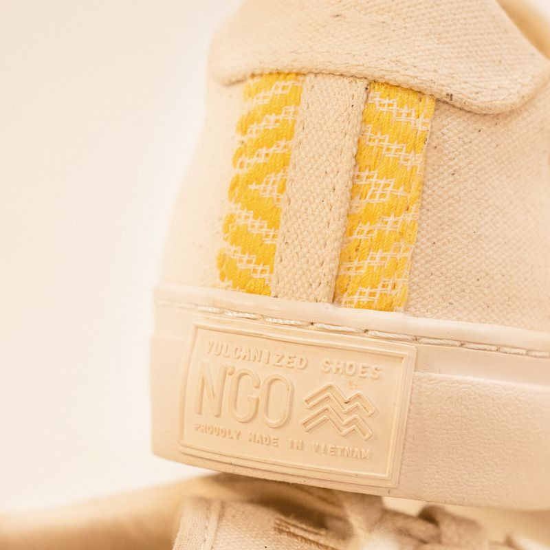 This woven band is the N'GO signature. When you wear these sneakers, you're supporting the skills of independent Vietnamese craftswomen. The motifs in the Mai Chau collection were hand-woven by Thoa, an autonomous and independent Vietnamese craftswoman from the White Thai ethnic minority in Mai Chau, hence the choice of collection name.