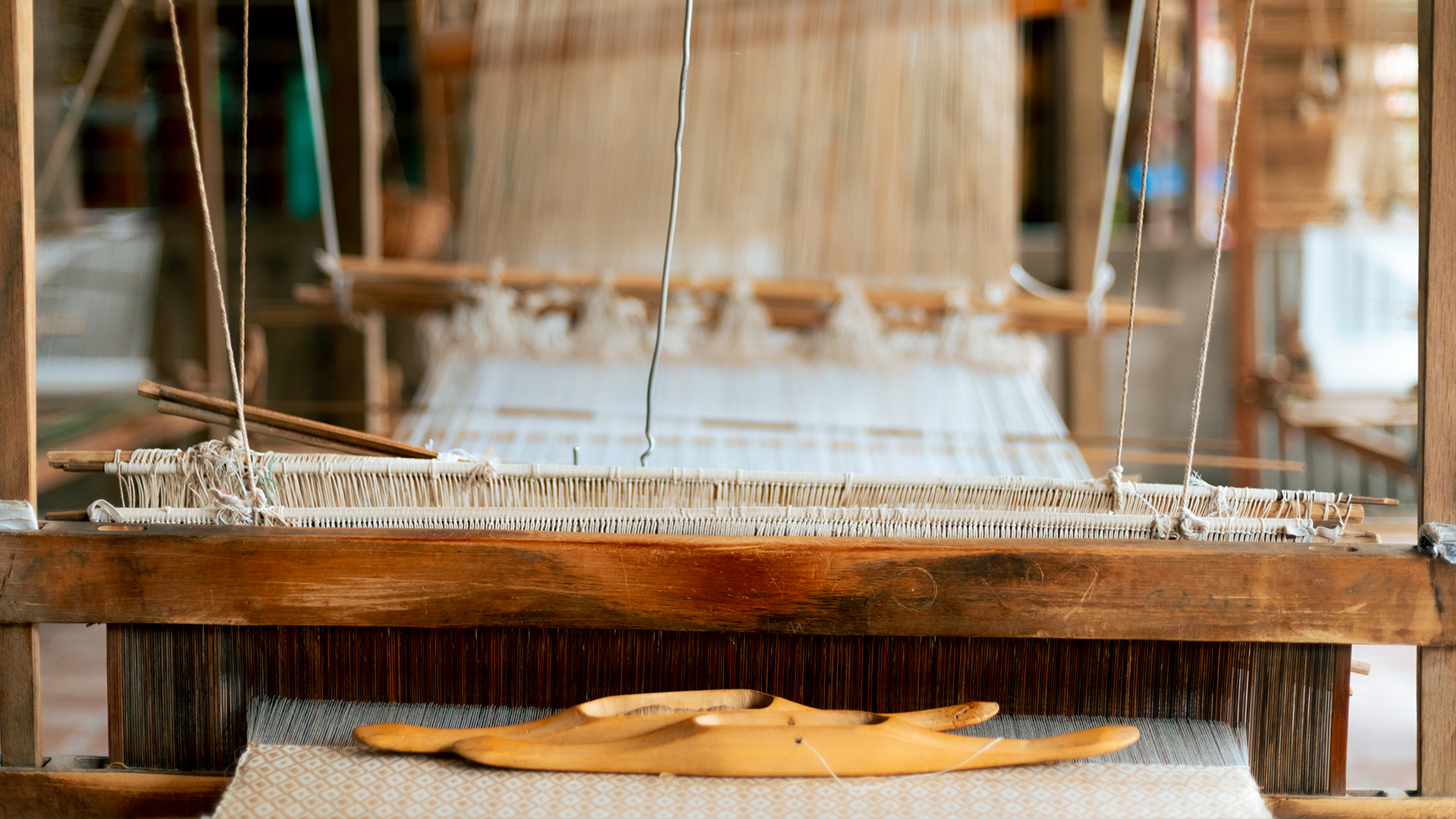 According to the desired pattern, the threads are then crossed horizontally and vertically, thanks to the sliding of a wooden shuttle (rod from which a small spool of threads is unwound) from left to right. This is the principle of "warp and weft" weaving.